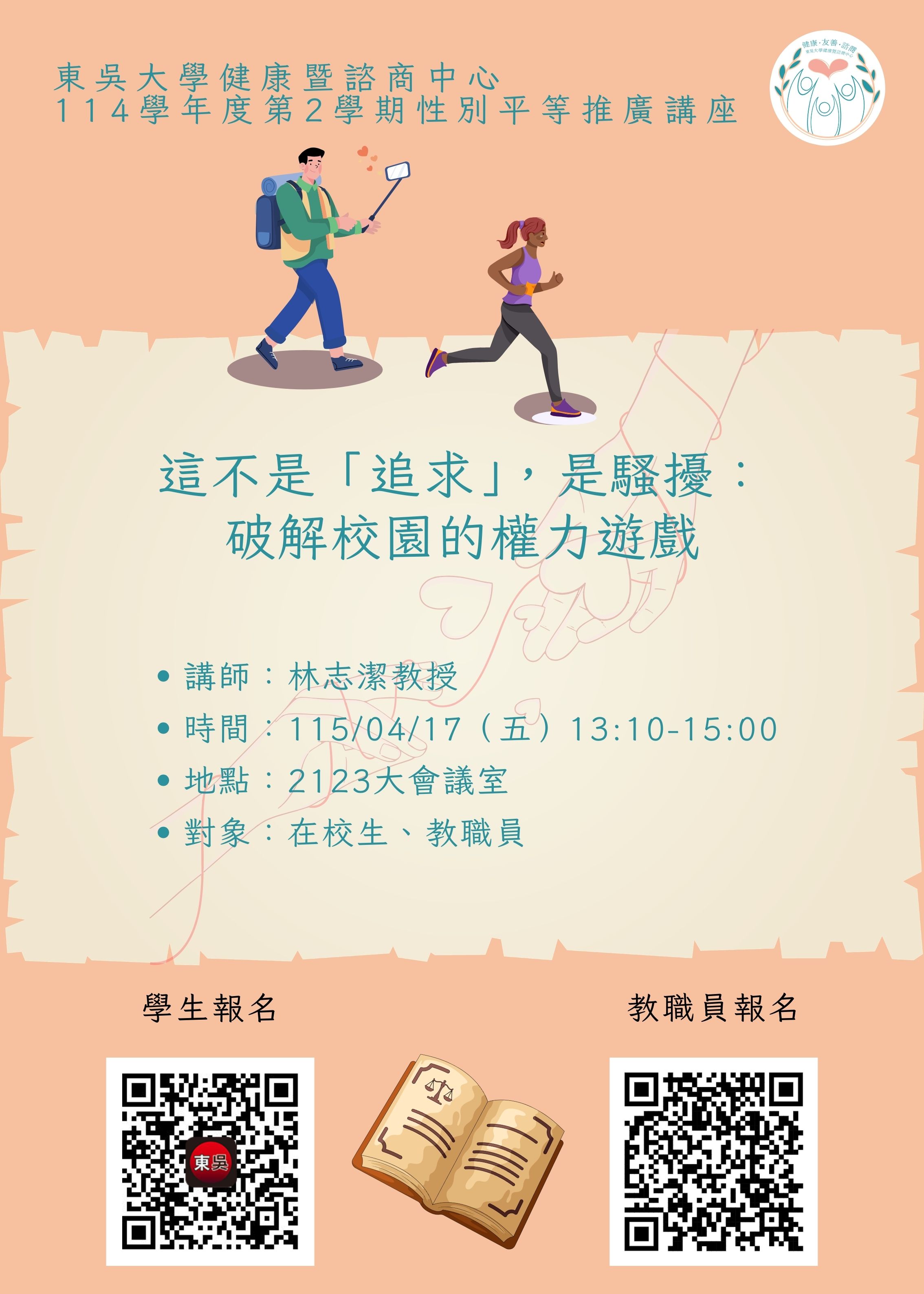 【健康暨諮商中心】《這不是「追求」,是騷擾:破解校園的權力遊戲》性別平等推廣講座