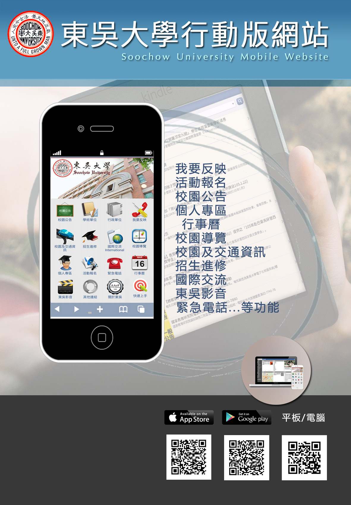 東吳校園APP已於2/18日上線囉! 師生透過手持式設備(手機、平板)即可瀏覽校內公告、活動報名及查詢相關資訊。詳細校園APP下載,請參看附件。