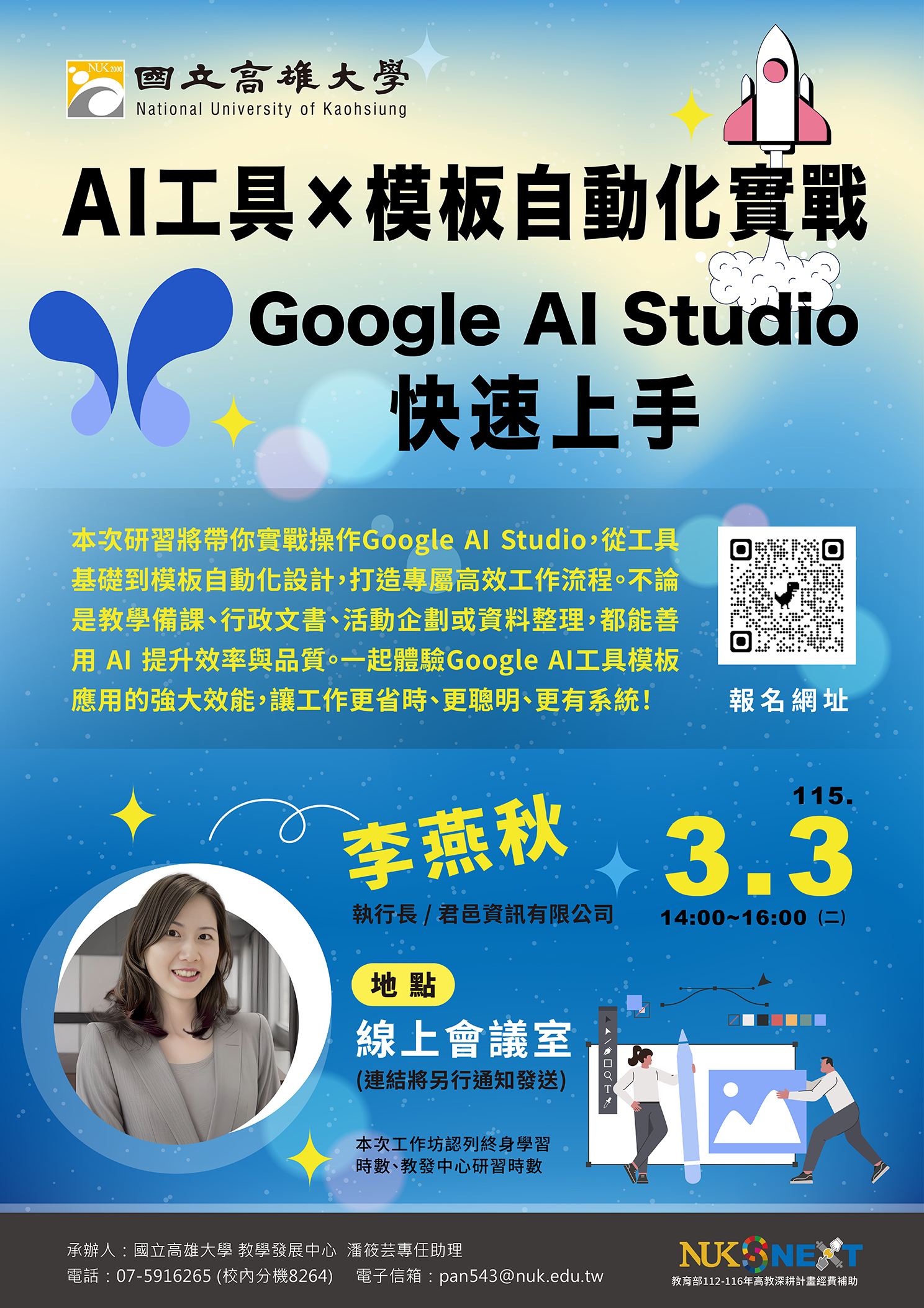 - 【教學資源中心】轉知:國立高雄大學辦理「AI工具×模板自動化實戰:Google AI Studio快速上手」線上研習資訊,邀請本校教職員生報名參加。