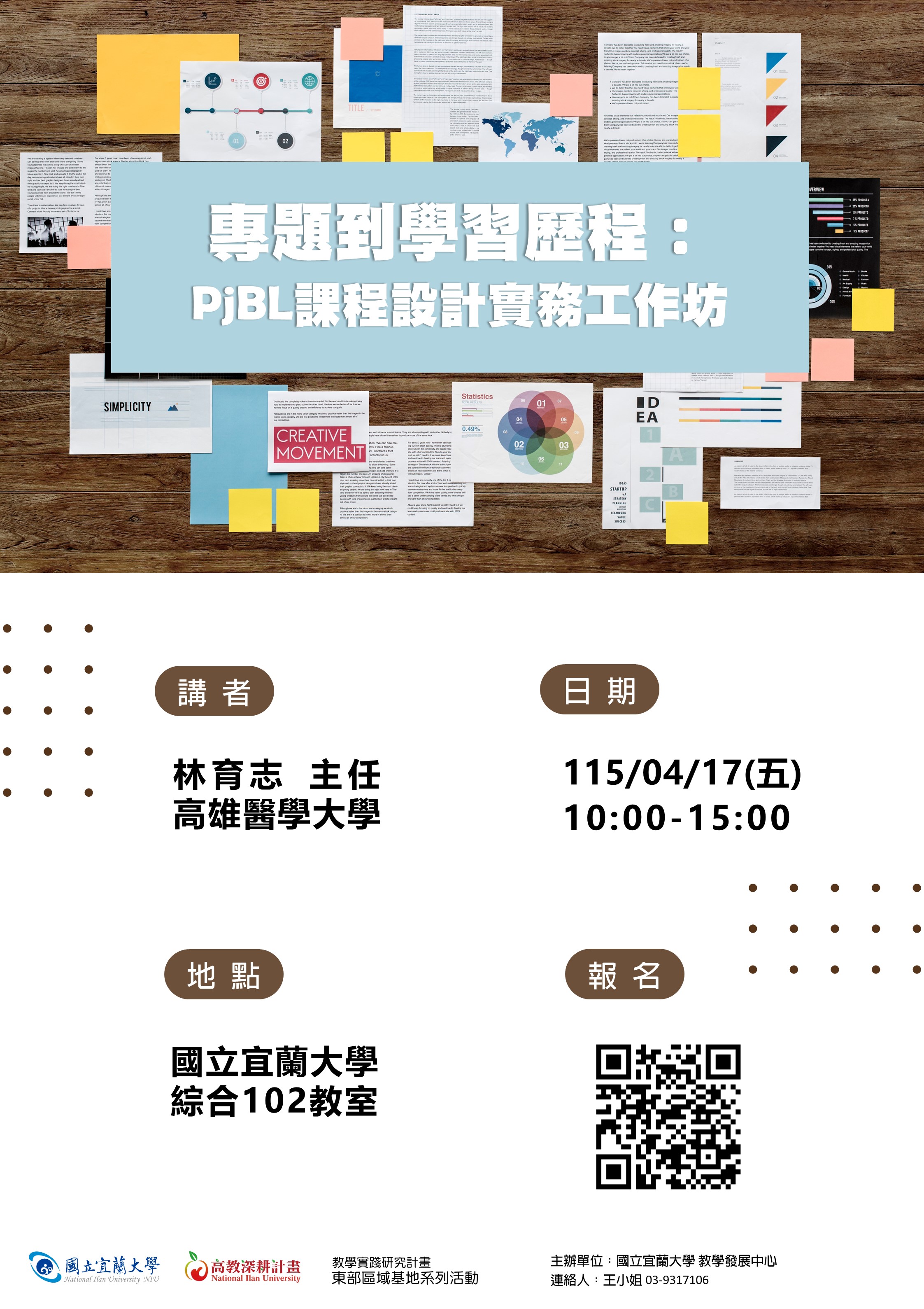 【教學資源中心】轉知:國立宜蘭大學辦理之「專題到學習歷程:PjBL課程設計實務工作坊」,歡迎本校教師報名參加。