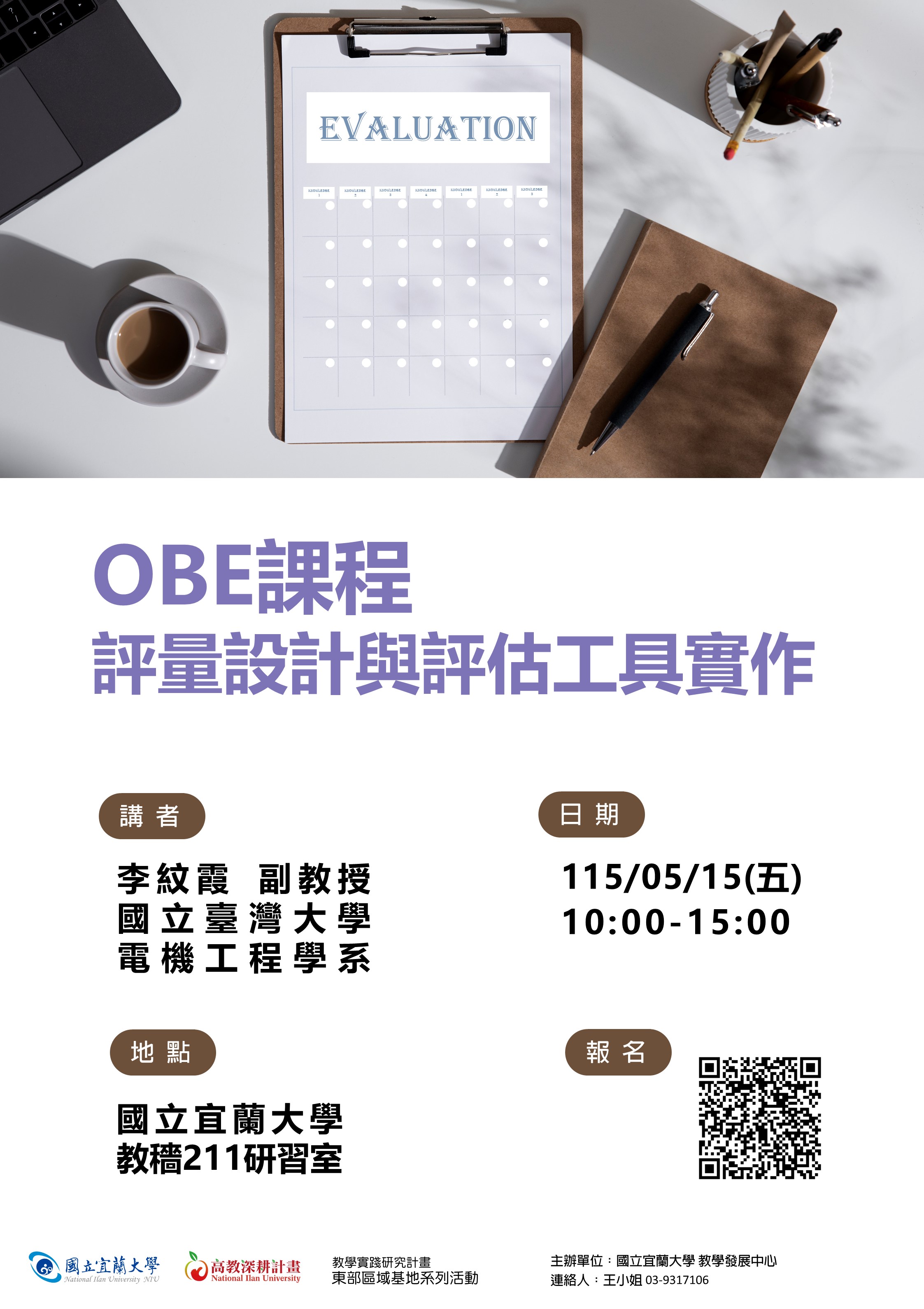 【教學資源中心】轉知:國立宜蘭大學辦理之「OBE課程評量設計與評估工具實作工作坊」相關資訊。