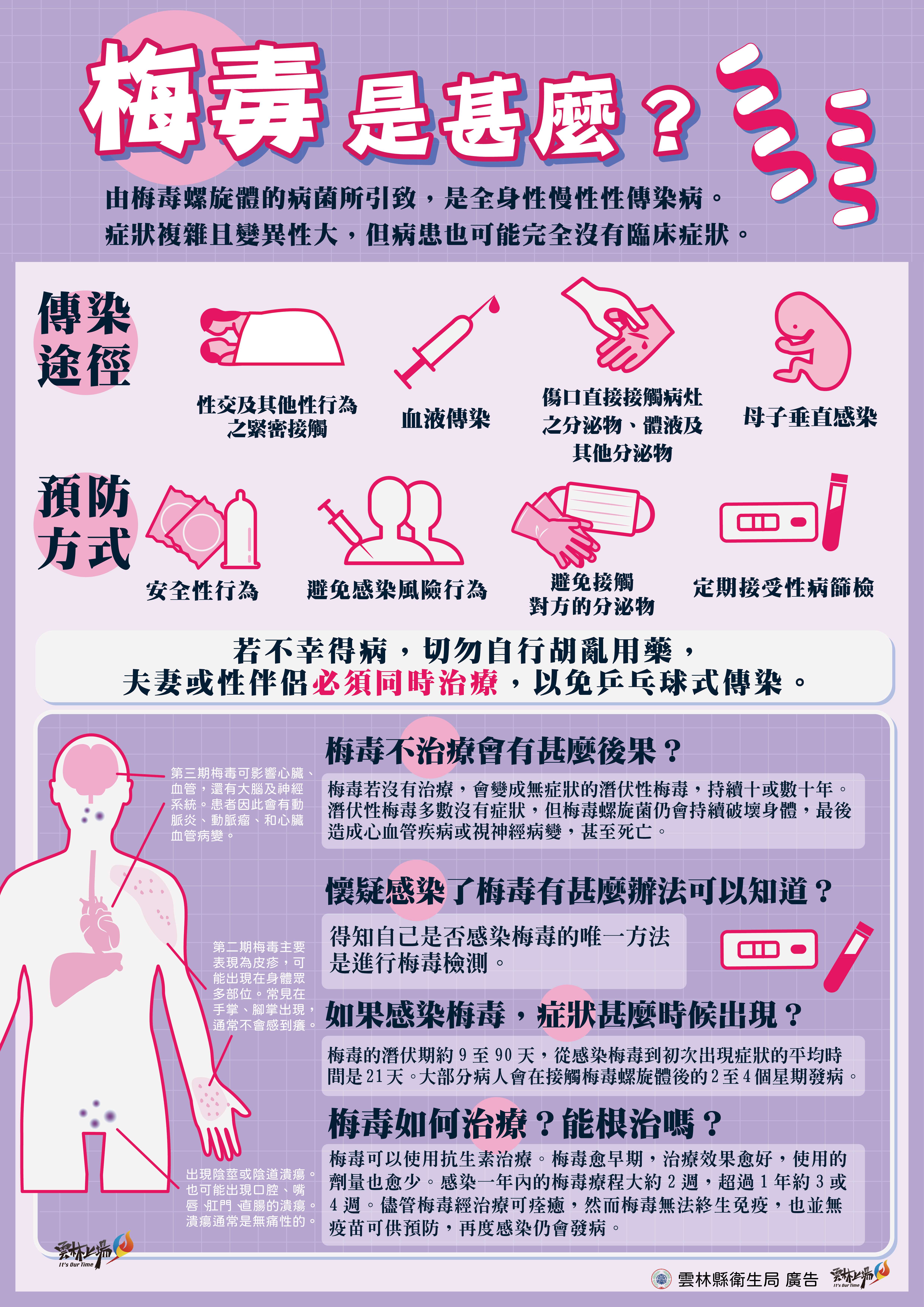 三、感染梅毒可能出現生殖器無痛性潰瘍及硬性下疳、全身性紅疹及扁平濕疣,並出現頭痛、倦怠、發燒、體重減輕、肌肉骨骼與關節疼痛等,若仍未接受適當治療,通常於感染後3至7年,梅毒螺旋菌可能侵犯神經、腦部,造成「神經性梅毒」或「心臟血管性梅毒」等不可逆的損傷。