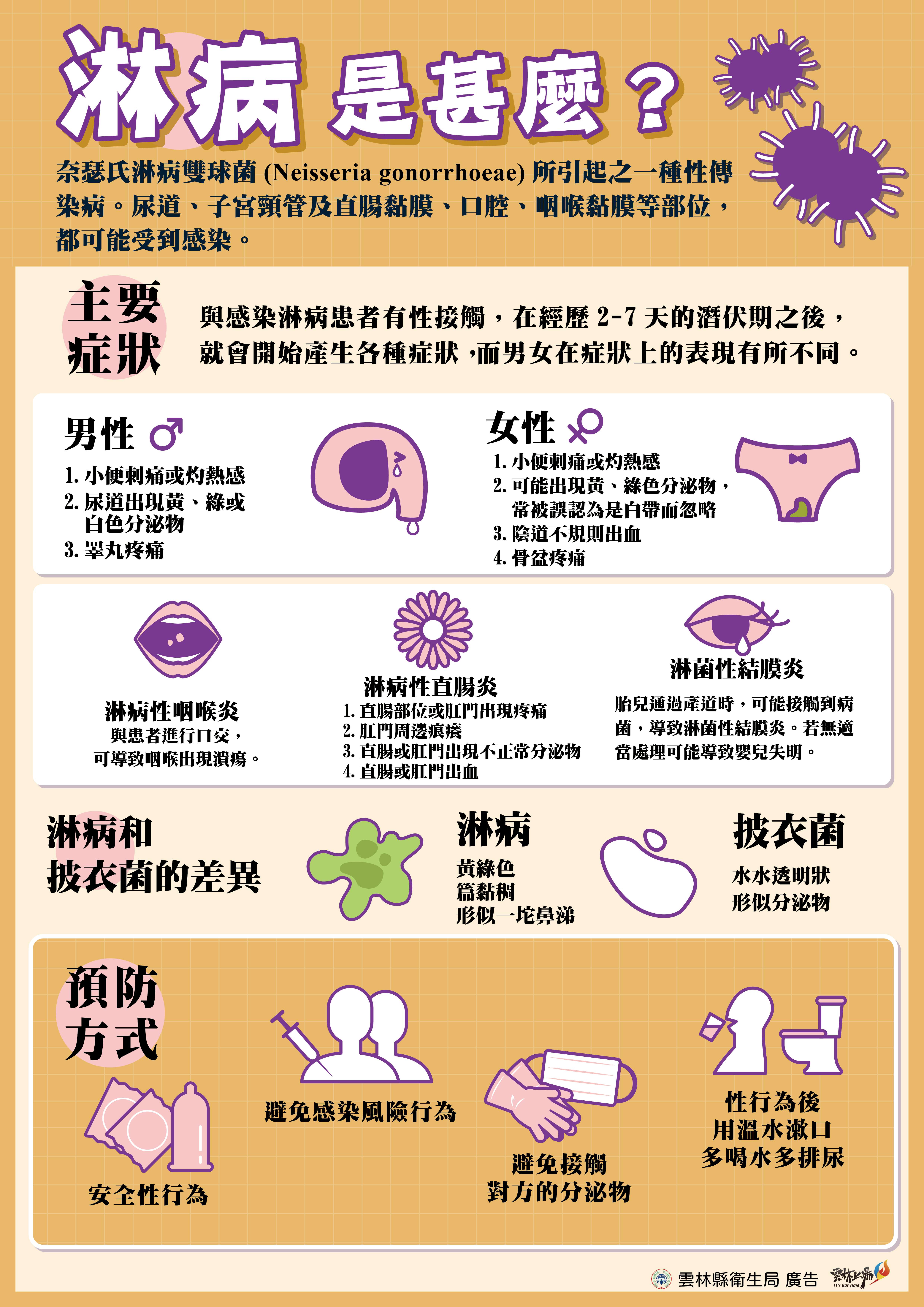 四、女性感染淋病後臨床症狀並不明顯,常被忽略而未積極治療,除增加傳染給性伴侶之機會,亦可能因重複感染而引起子宮或骨盆腔發炎等,增加日後子宮外孕或不孕風險,亦有可能造成新生兒感染淋菌性結膜炎。