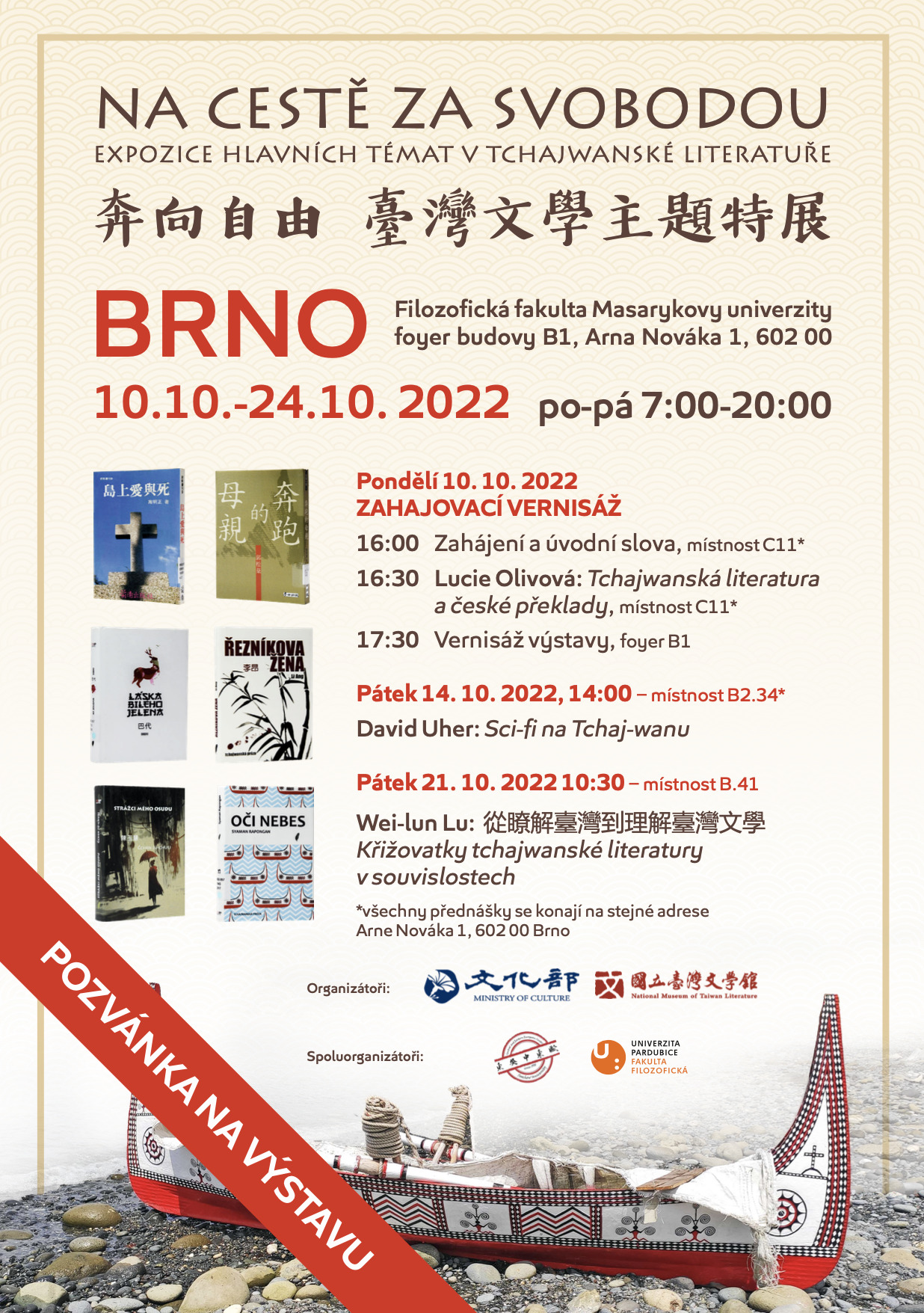 「奔向自由,臺灣文學主題特展」10月10日至24日在捷克馬薩里克大學展出,接著移往Olomouc市和Pardubice市,進行為期兩個月的巡迴展覽,期待透過文學交流,增進捷克人民對臺灣社會的認識,深化臺捷兩國的友好情誼。