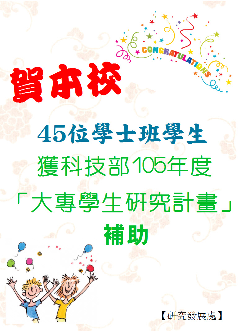 科技部日前公布105年度大專學生研究計畫核定名單,本校45位學士班學生獲得補助,通過率達49%,高於今年度科技部全國通過率43%,名單如下: