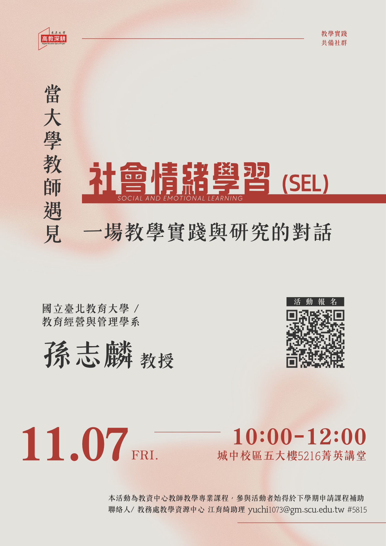 本場講座以「當大學教師遇見社會情緒學習(SEL):一場教學實踐與研究的對話」為題,邀請孫教授從實際的研究案例與教學經驗出發,帶領與會者思考如何在課堂中融入 SEL 的理念,促進學生的自我覺察、人際互動與學習動機,建構更具溫度與反思力的教學文化。透過對話與分享,期望能為大學教師開啟更多以「人」為本的教育想像,深化教學的專業與人本內涵。歡迎有興趣的師生同仁踴躍參與!