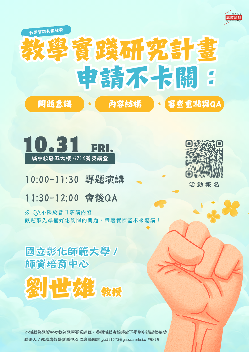 - 【教學資源中心】本校教學資源中心辦理「教學實踐研究計畫申請不卡關:問題意識、內容結構、審查重點與QA」實體講座,歡迎踴躍報名!
