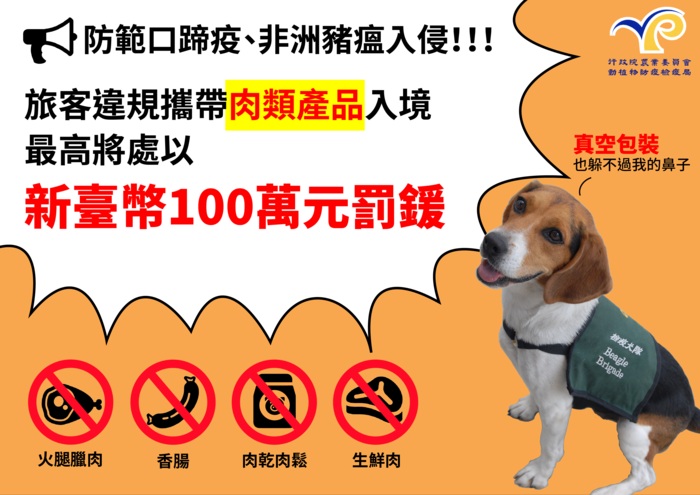 轉知教育部來函,轉知校內師生若出國往返各地時,返國時勿攜帶動植物檢疫物入境,以免造成非洲豬瘟傳播來源,個人受罰事小,全國人民無豬肉美食可吃事大,敬請配合!