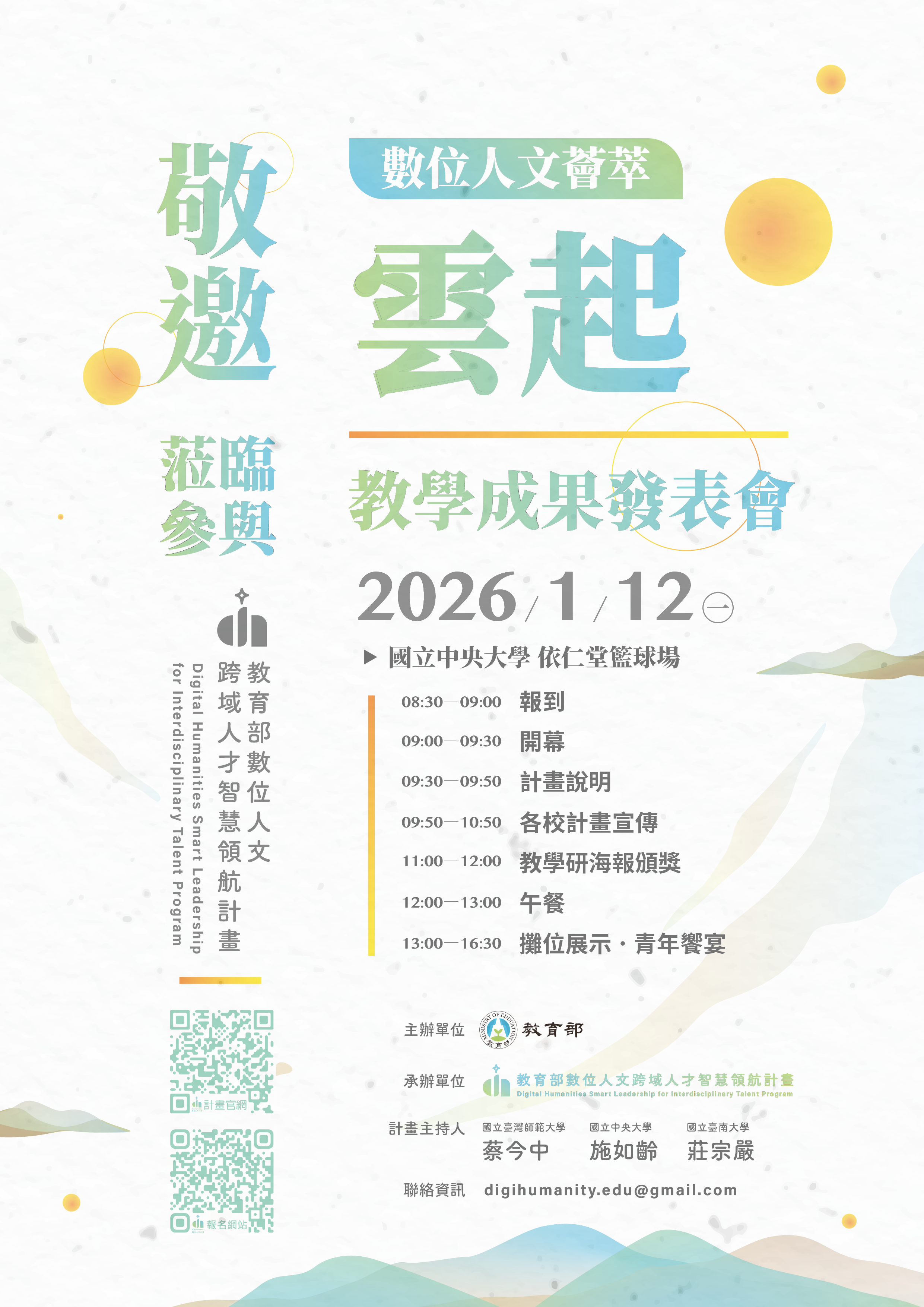 - 【教學資源中心】轉知:教育部辦理「數位人文跨域人才智慧領航計畫」教學成果分享會資訊,歡迎踴躍報名!