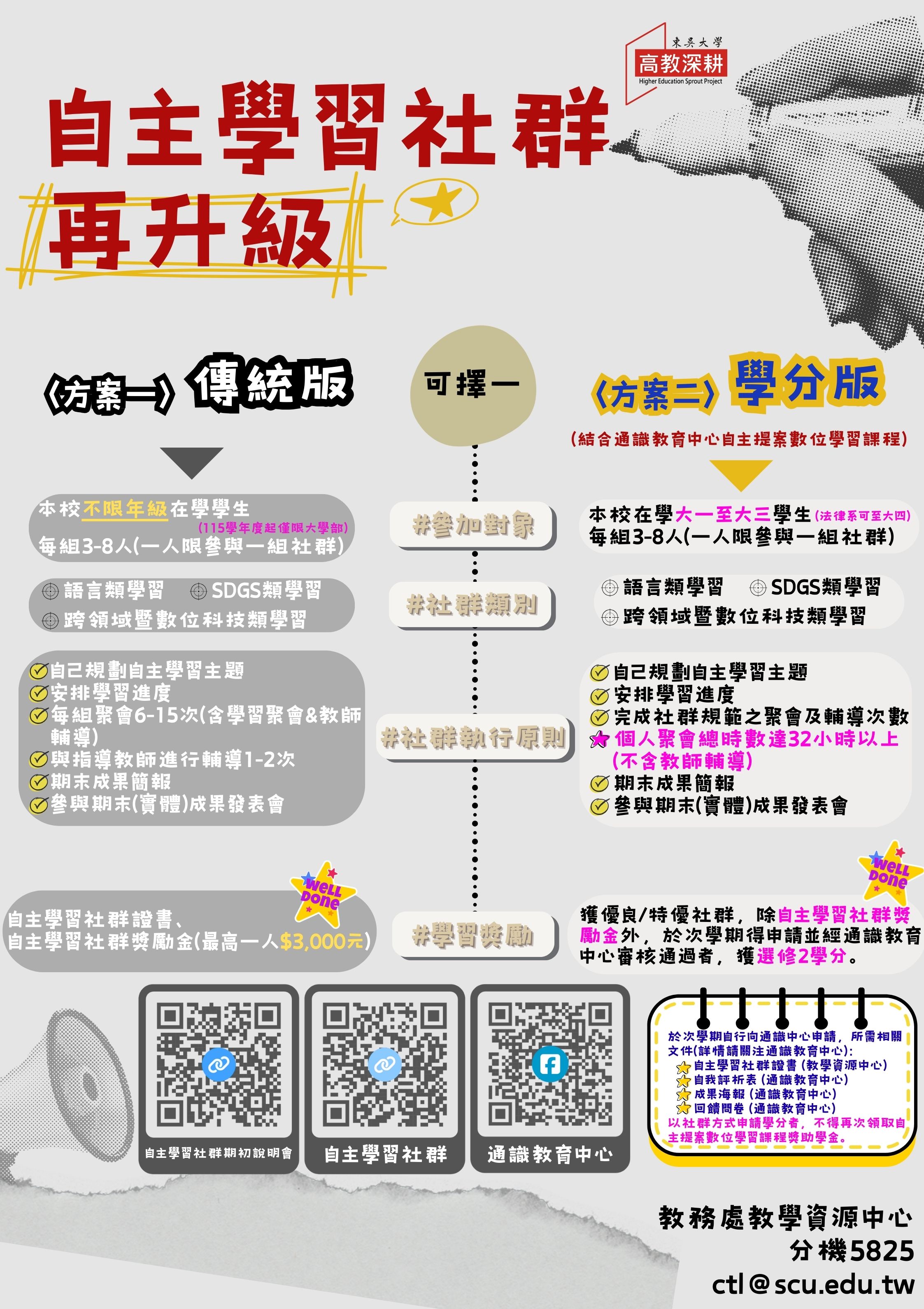 學生自主學習社群在持續觀察學生學習歷程並回應其學習需求的基礎上,不斷進行制度更新與改良,除將原有單學期制擴增為全學年制之學習選項外,亦為提升學生之學習動力與學習品質,本中心進一步與本校通識教育中心「自主提案數位學習課程(選修)」合作。透過此合作機制,學生得以在自由且自主探索自身興趣的學習歷程中,同步完成自主學習社群相關任務。✩✩✩114學年度第二學期起自主學習社群凡個人聚會時數累積達 32 小時以上者,除可獲得社群獎勵金外,若所屬社群獲評為優良或特優,更可於次一學期向通識教育中心申請並取得該選修課程 2 學分。✩✩✩