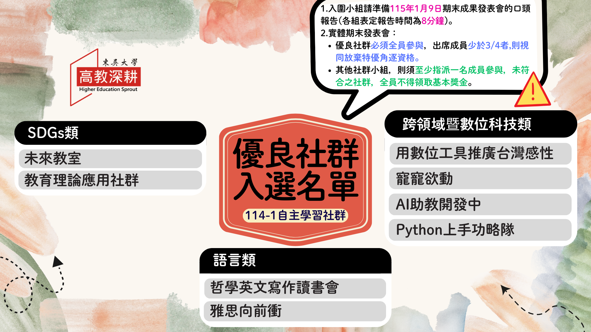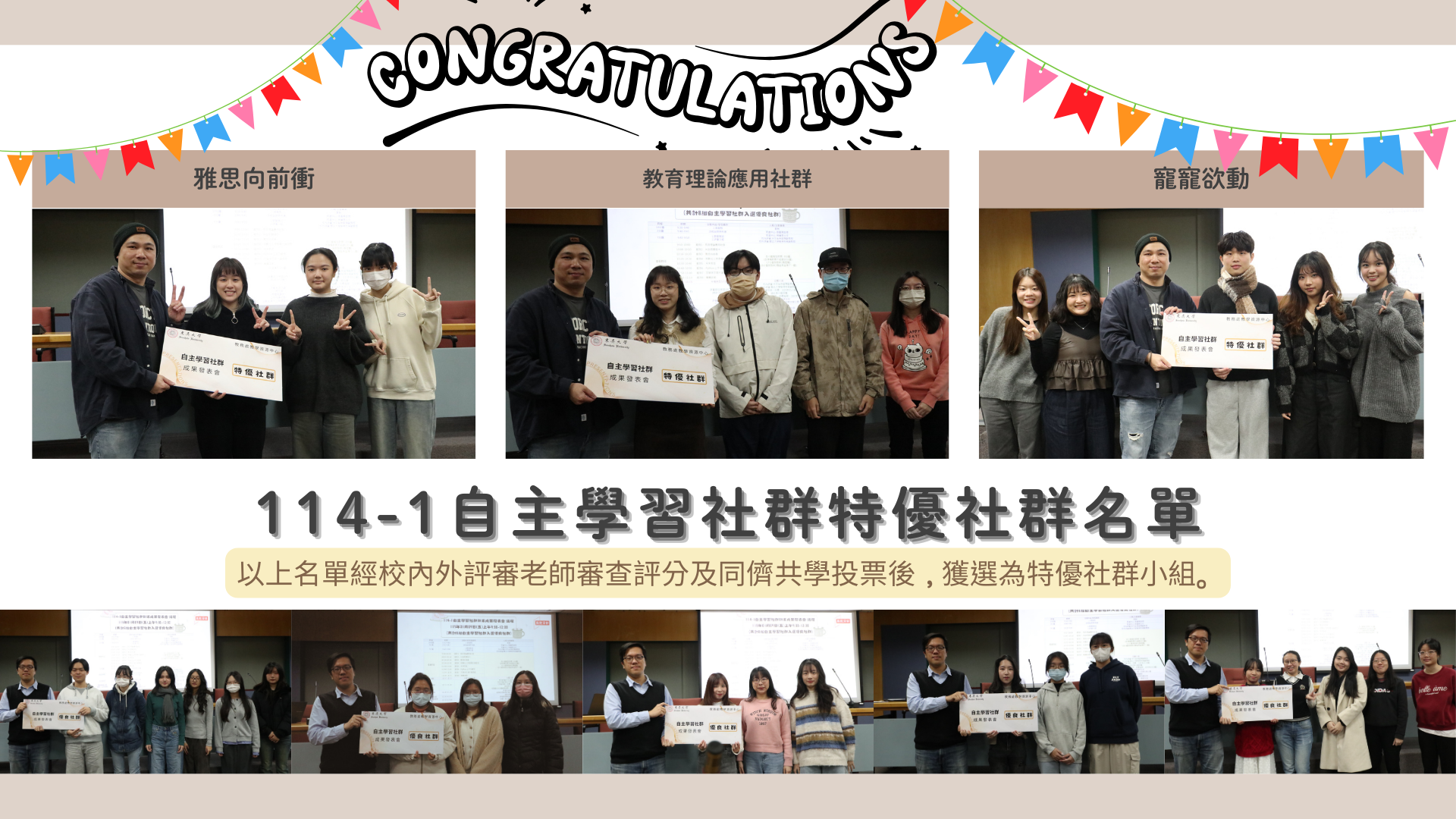 教學資源中心為提供參與自主學習社群小組展現本學期學習成果之舞台,於115年1月9日舉行期末成果發表會,會中不僅邀請校內外專家參與評審,當天亦邀請與會的自學社群學生們共同擔任評審一角,遴選及票選出表現優異之特優社群小組。最終獲獎結果為3組特優社群與5組優良社群,為鼓勵學生保持學習熱忱,於發表會當日公開表揚獲獎隊伍。詳細獲獎隊伍名單與評審建議摘要如下: